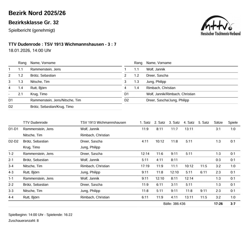 Nach den Doppeln beim 1:1-Zwischenstand noch ausgeglichen, Rammenstein/Nitsche punkteten gegen Wichmannshausens Wolf/Rimbach (3:1) und Dreer/Jung besiegten Dudenrodes Brötz/Krug (3:1), startete der Siegeszug für den TSV. Bis zum 6:2-Siegpunkt durch Sascha Dreer gegen Sebastian Brötz (3:1) musste sich nur Christian Rimbach noch Dudenrodes Tim Nitsche in fünf Sätzen (19:17, 9:11, 1:11, 12:10, 5:11) geschlagen geben.